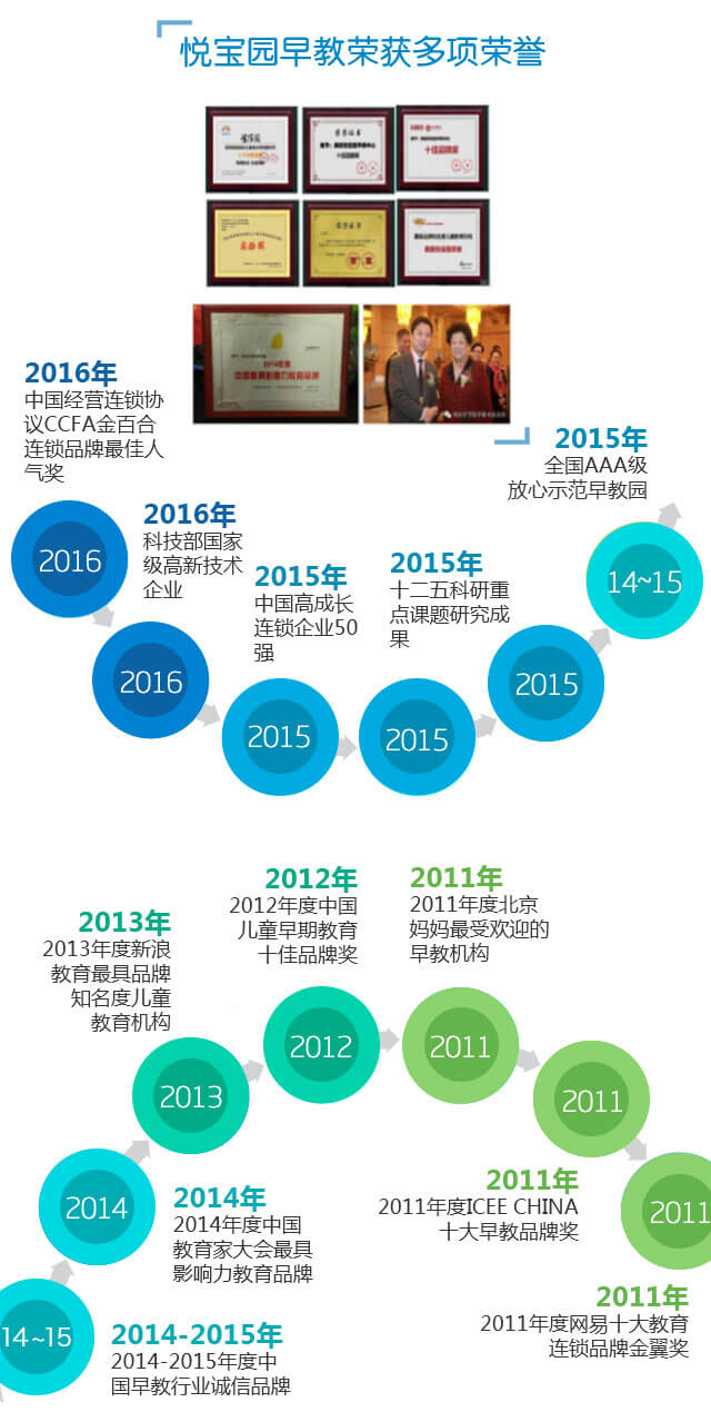 今天的悦宝园®在中国已经有200余家专业的早教中心,拥有超过1000位指导师组成的训练有素的教师团队以及众多获奖的课程,与超过百万的家庭共同见证了孩子的成长。悦宝园海外引进和自主研发结合的科学早教体系集合了悦宝灵动、悦宝创意、悦宝韵律、悦宝英语四大系列课程,综合开发0-8岁宝宝七大潜能。 悦宝园致力于让家长和孩子们每次上课都能充分享受其中的快乐,同时从适龄性极强的课程中增强肌肉力量、锻炼全身平衡、发挥语言能力、培养音乐潜能、激发艺术创造力、推动全脑协调、提高敏捷度和社交能力,实现全面成长。